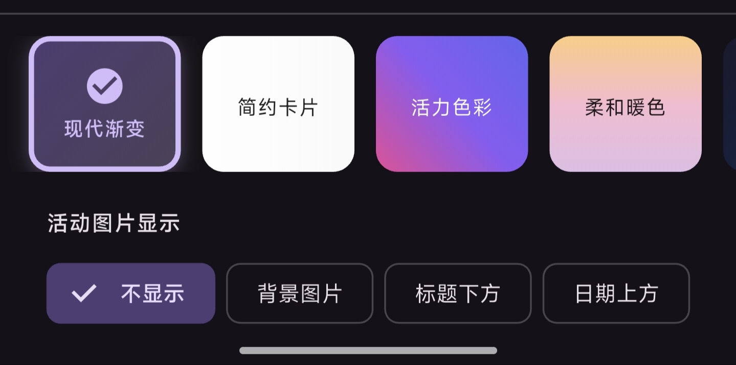其中,“现代渐变” 将会采用当前应用的主题色。主题色可以在设置中更改,根据版本不同,可能会有所限制,详细请见设置相关文档。